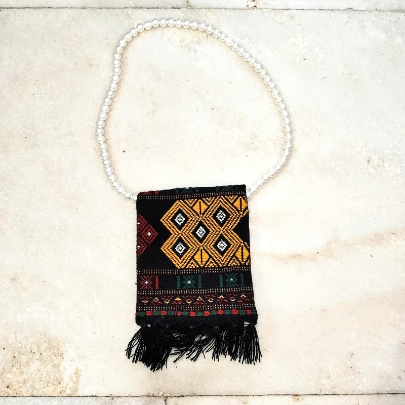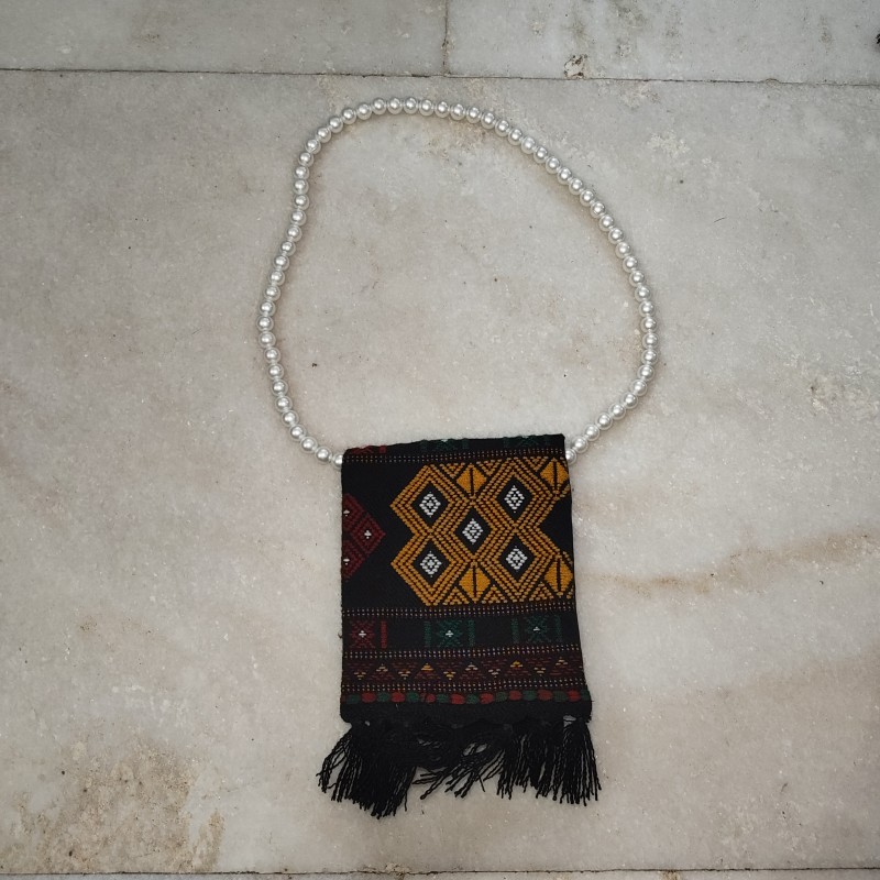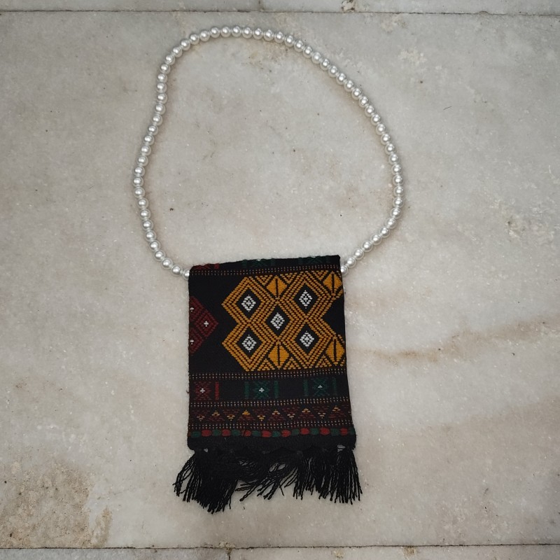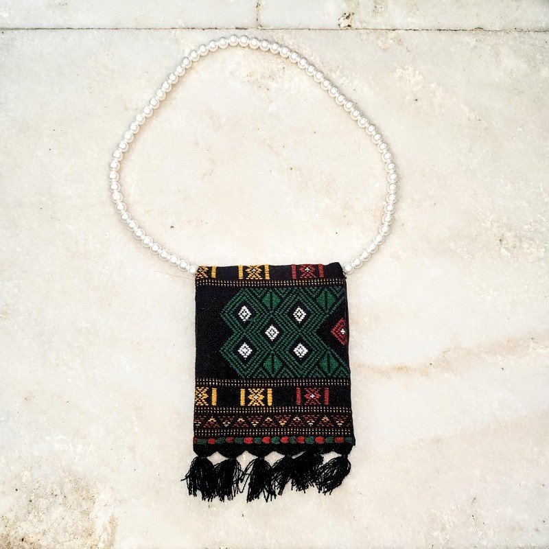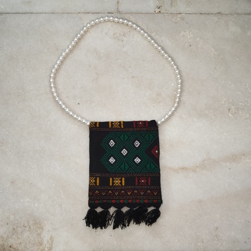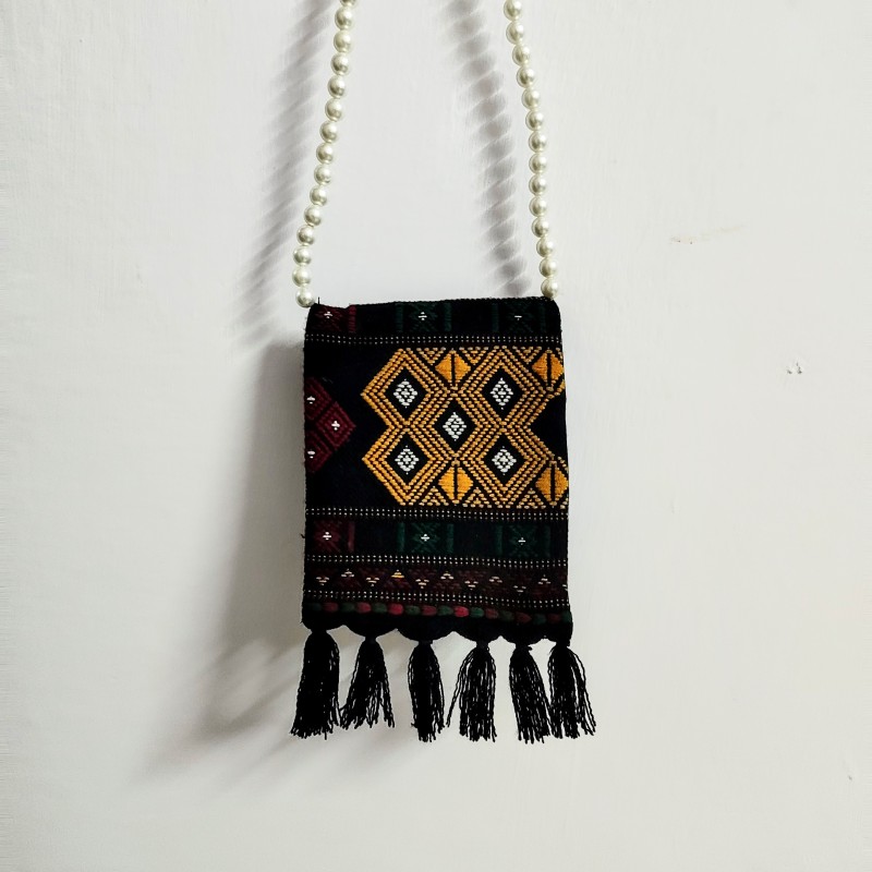 This beautifully handcrafted mini traditional bag is specially designed for children, inspired by cultural motifs such as Khamtang, Saipikhup, and Thangnag. The main body showcases vibrant gem-like diamond patterns in green, red, and white on a deep black base, echoing traditional tribal aesthetics. The highlight of this mini bag is its elegant pearl handle, adding a playful yet graceful touch—perfectly suited for special occasions or cultural wear. The tassel fringes at the bottom enhance its ethnic appeal, while the compact size makes it ideal for kids.